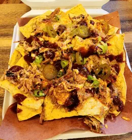 BBQ NachosChoice of beef or pork with nacho cheese, jalapenos, green onions, BBQ sauce, and a dusting of BBQ seasoning on a bed of tortilla chips.$17.00