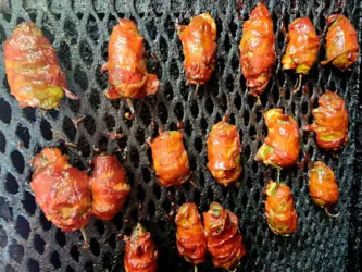 BBQ PoppersJalapeno poppers filled with brisket or pork, cream cheese and wrapped in bacon with a BBQ glaze.2 for $10.00